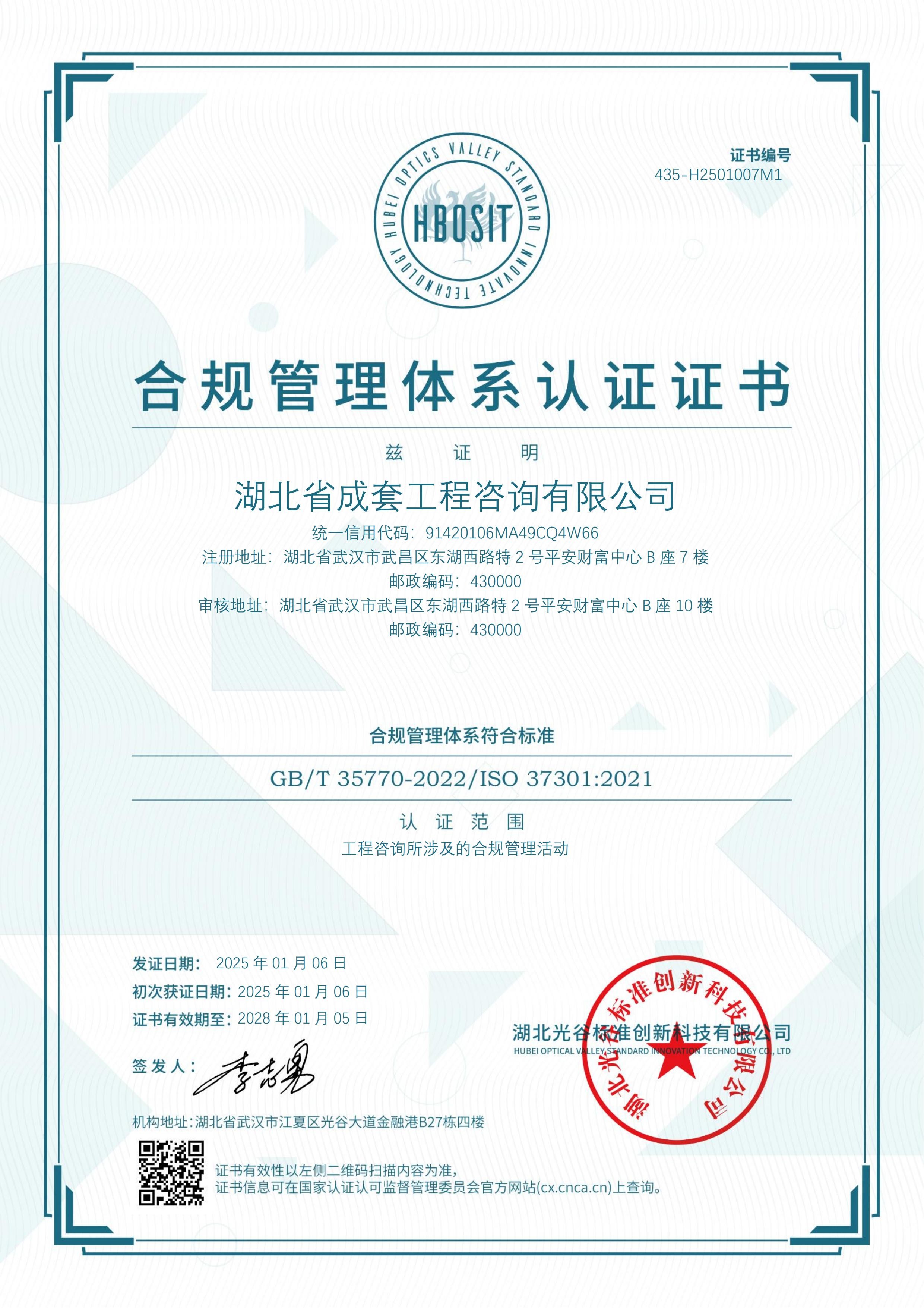 湖北省成套工程咨询有限公司合规管理体系认证证书
