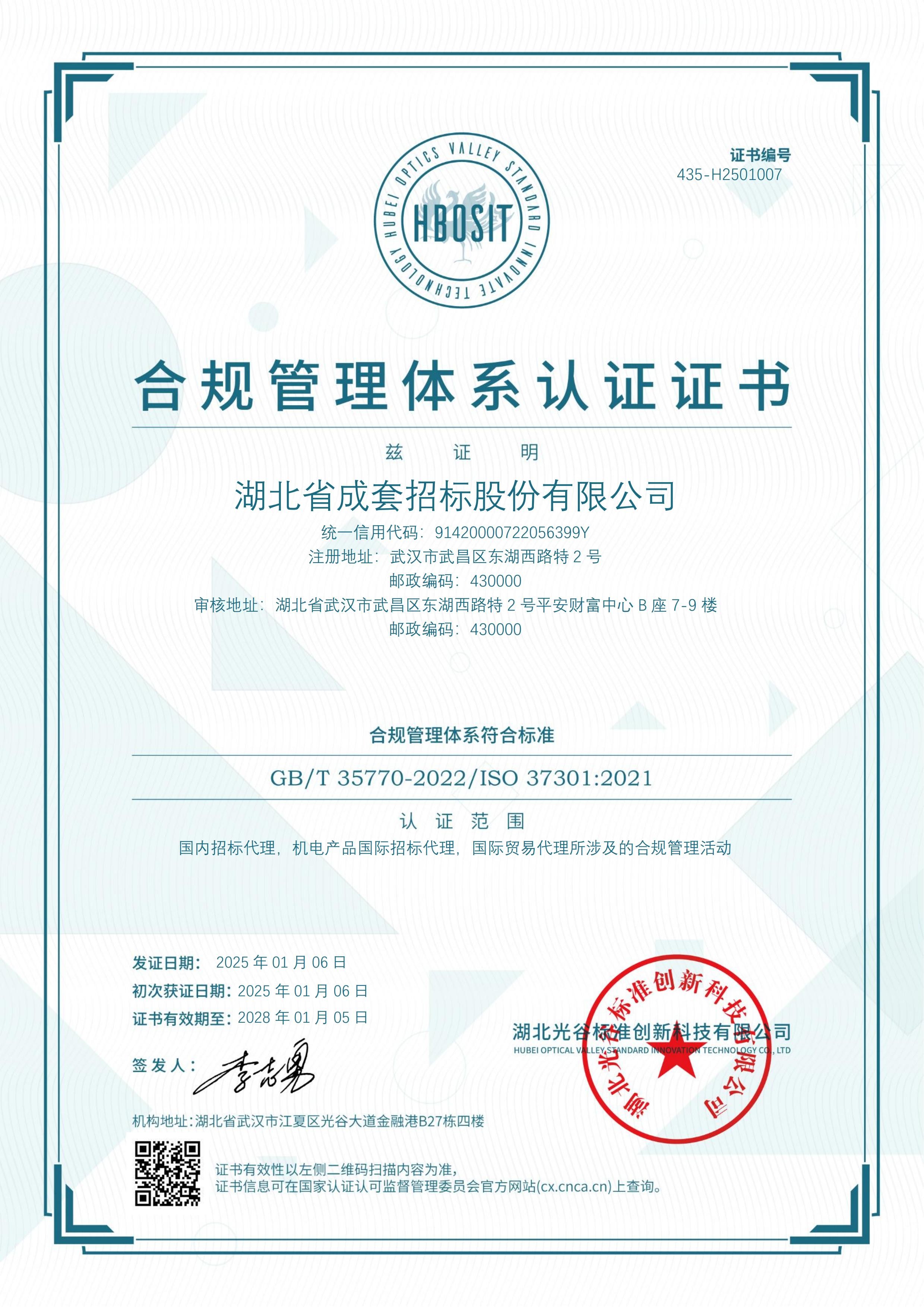 湖北省成套招标股份有限公司合规管理体系认证证书